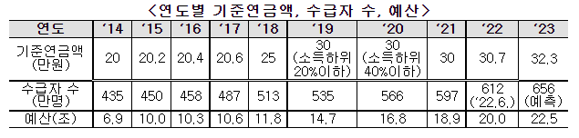 기초연금이 도입되었던 2014년 435만 명이었던 수급자가 2023년 약665만명으로 증가하여 관련 예산도 약3.3배 증가된 22.5조원 입니다.