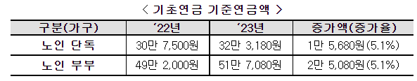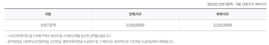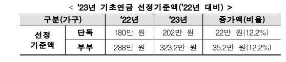 1. 2023년 기초연금 선정기준액 : 단독가구 월 202만원 / 부부가구 월 323.2만원