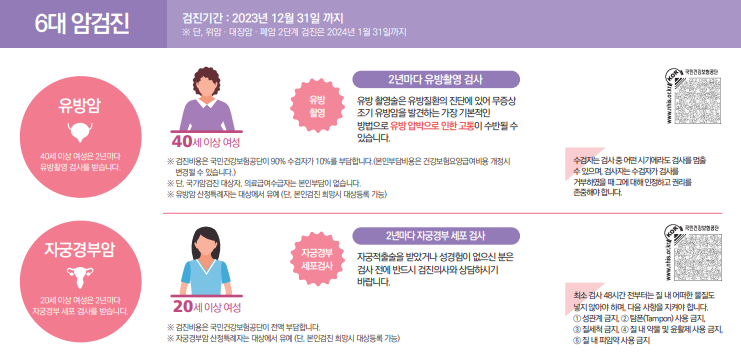 이 외에도 국가 건강검진에서는 다양한 종류의 암에 대한 검진이 제공되고 있으며, 각 검진의 연령 및 주기는 건강보험공단 등에서 안내되고 조정될 수 있습니다.