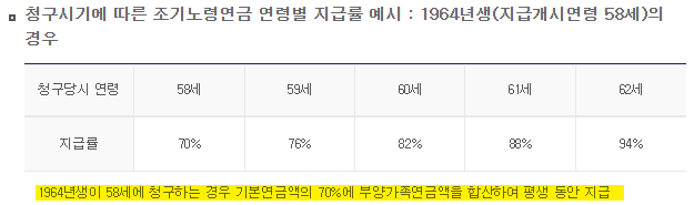 1964년생이 58세에 청구하는 경우 기본연금액의 70%에 부양가족연금액을 합산하여 평생 동안 지급받게 되니 조기 수령을 신청하기 전 신중한 판단이 필요합니다.
