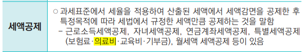 세액공제는 납부해야할 세금을 직접 차감하는 제도로 소득에 상관없이 조건,항목에서 동일하게 적용 받습니다. 연말정산시 100만원의 세금을 추가 납부해야할 경우 세액공제 항목은 100만원의 세금을 직접 차감하는 방법입니다.