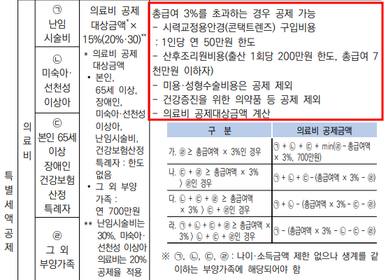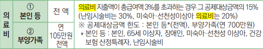 의료비는 연간 총 급여액 3%를 초과하는 경우 그 공제대상금액의 15% 공제(난임시술비 30%, 미숙아,선천성이상아 의료비 20%공제)