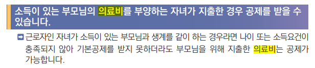 부모님이 소득이 있더라도 자녀가 대신 의료비 항목을 가져올 수도 있고 반대로 자녀의 의료비를 부모님이 공제 받을 수도 있습니다. 단 부모님을 부양하는 1인의 의료비 지출액만 공제가 가능하기 때문에 형제자매가 부모님을 위해 지출한 의료비 부인 부담액을 각각 공제 받을 수 없습니다.