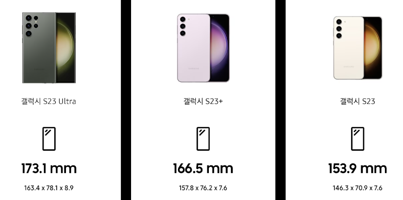 ■ 갤럭시 S23 Ultra의 화면 크기는 코너 곡선을 제외하고 직각화하여 대각선으로 측정 시 173.1 mm이며, 직각화하지 않고 측정 시 172.5 mm입니다.