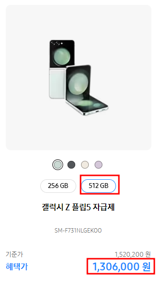 ■갤럭시z플립5 [512GB] 1,520,200원 → 1,306,000원